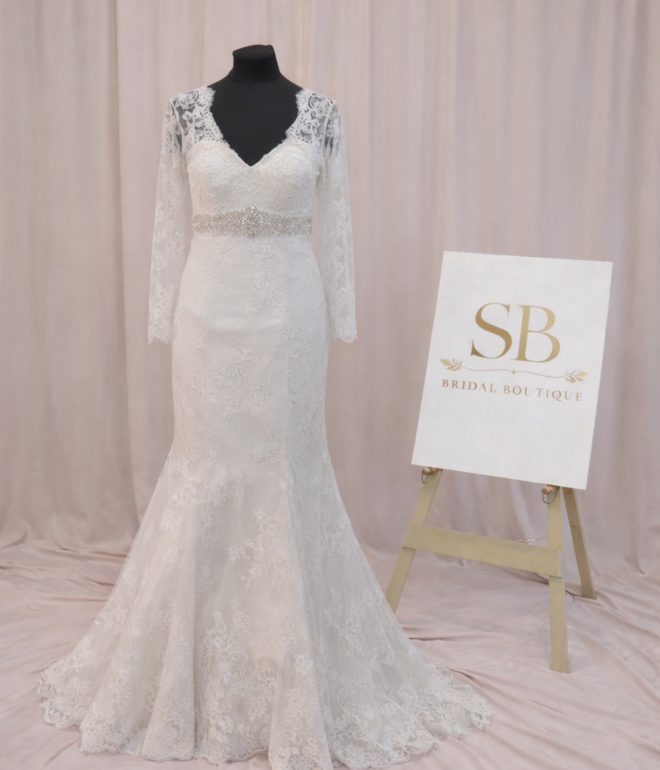 This elegant Justin Alexander lace wedding dress brings timeless romance with a modern silhouette. Designed with delicate all-over lace and softly scalloped edges, the gown features a flattering V-neckline and sheer long lace sleeves that frame the bodice with subtle sophistication. A gently fitted waist flows into a graceful fit-and-flare skirt, creating a beautiful line that moves effortlessly down the aisle.