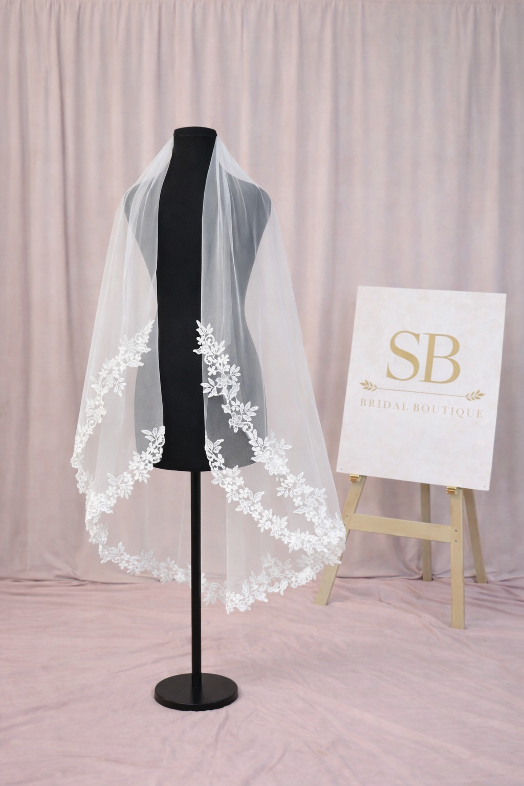 This elegant cathedral length veil is crafted from soft, sheer tulle and finished with delicate floral lace appliqué along the hem. The lace detailing gently frames the train, creating a romantic and timeless look that flows beautifully behind the bride. Lightweight and airy, it drapes effortlessly from the crown and moves gracefully with every step. Perfect for brides looking to add a classic statement to a modern or traditional gown, this veil pairs beautifully with lace, satin, or minimalist dresses.